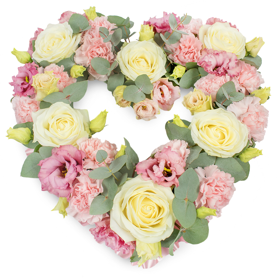 Show your appreciation and love with our beautiful open heart tribute bouquet. This exquisite arrangement combines white roses, lovely pink carnations, elegant pink lisianthus, and aromatic eucalyptus leaves, all hand-selected to ensure exceptional freshness and quality.